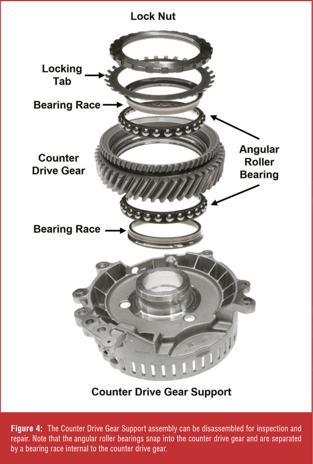 One area of concern is the counter drive gear sub-assembly support bearing area (Figure 4). The nut that retains the races may come loose and allow the transfer gear to move. The condition is caused by a locking tab that keeps the nut from backing off its set position, which was not bent enough during assembly. Symptoms associated with this issue include the following: