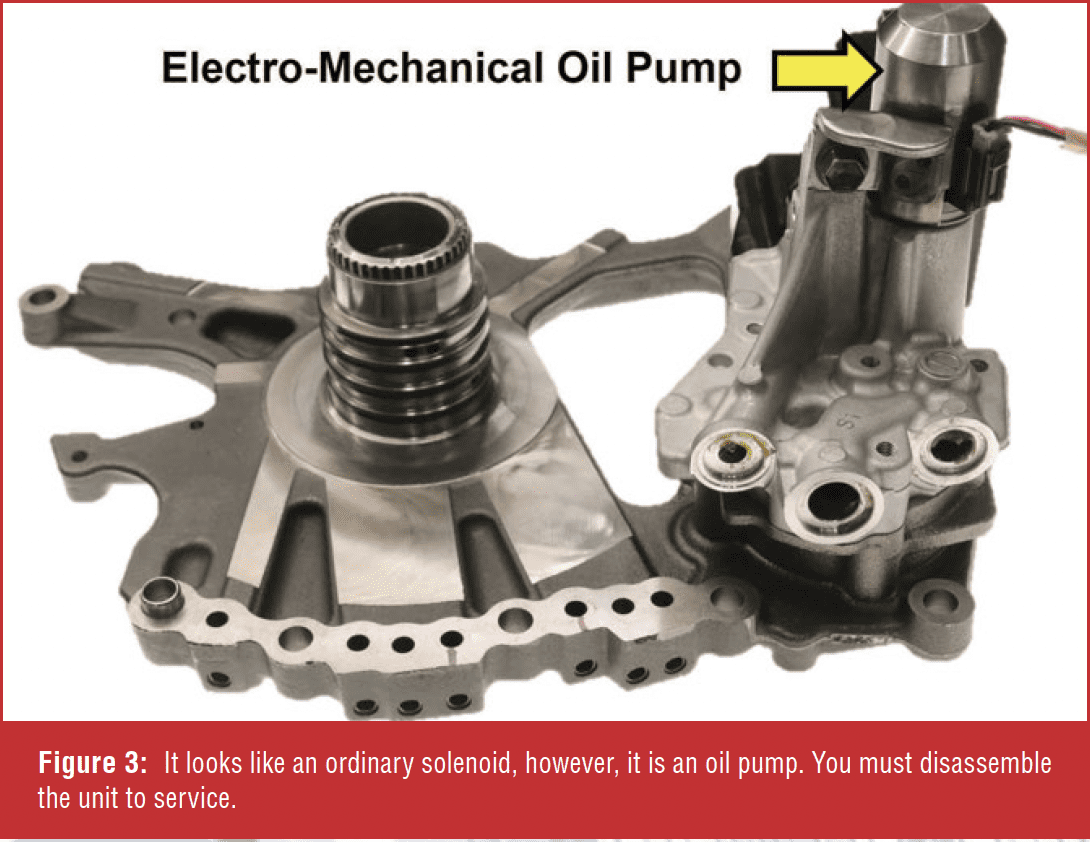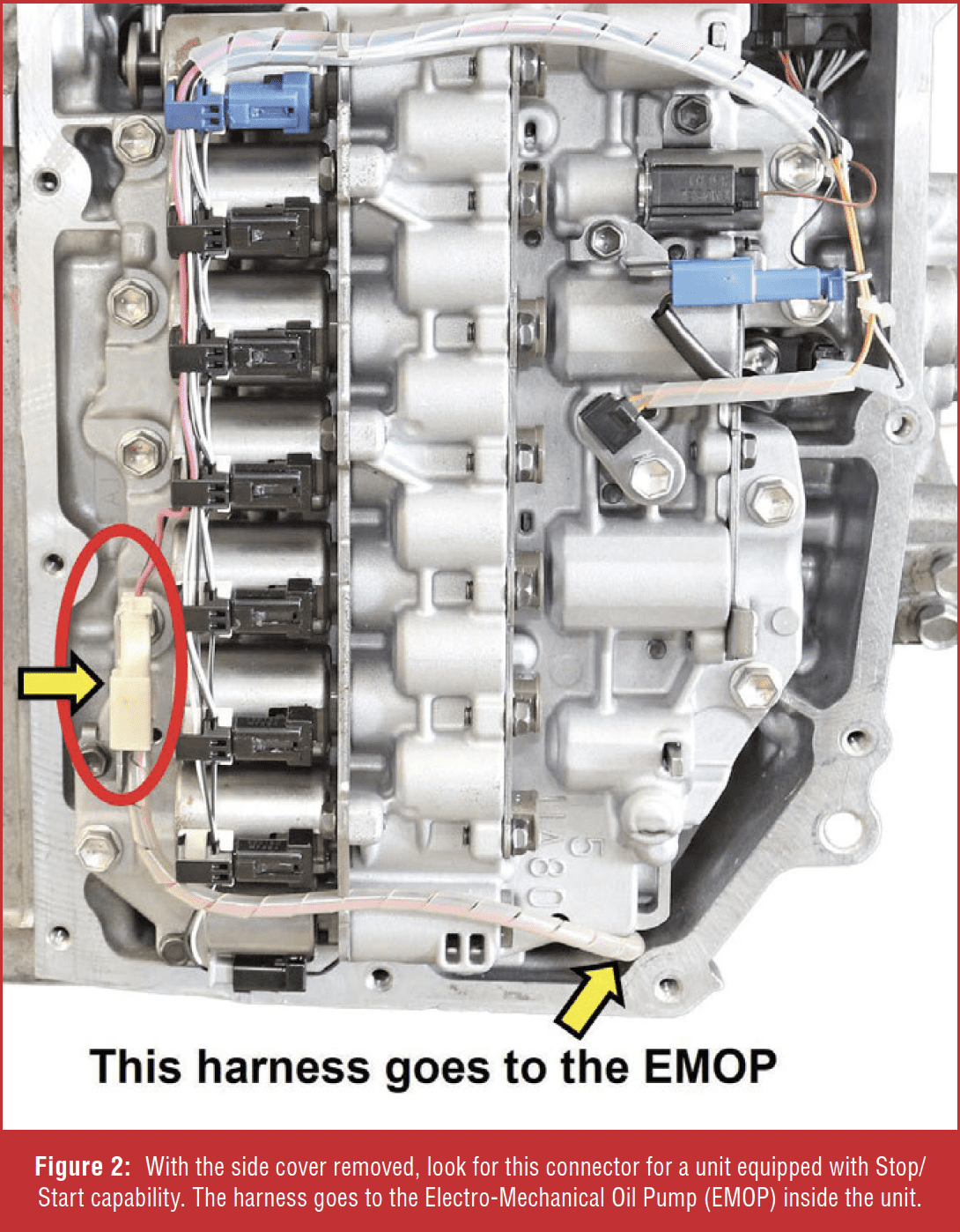 Finally, these units can be fitted with Stop/Start capability. Looking at the dashboard gives you a quick read on the unit coming out of the car. However, if the unit comes from a recycling yard or a remanufacturer, you can pull the side cover and observe the solenoid layout. A unit that has a Stop/Start pump will have an extra connector (white with red and black wires) coming from underneath the valve body (Figure 2). The harness goes to the Electro-Mechanical Oil Pump (EMOP), which is mounted on the transmission pump housing and can only be serviced by disassembling the unit (Figure 3).