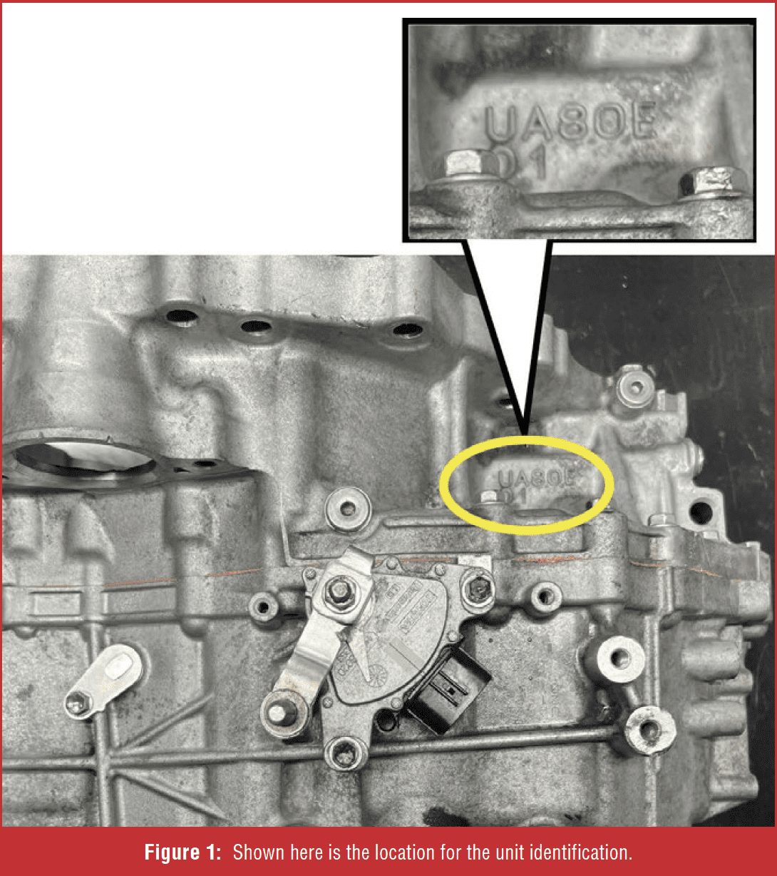 Identifying the unit you are working on is essential. The UA80 has a few variants that are easy to pick out. First, there are four-cylinder versions (UB80) and six-cylinder versions (UA80). The case has an identification embossed on the converter housing side of the unit (Figure 1). Next, the suffix determines whether the unit is two-wheel or four-wheel drive. For example, UA80E = two-wheel drive, and UA80F = four-wheel drive.