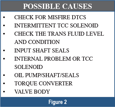 According to Chrysler service information, when the TCC is commanded on, the PCM expects to see an RPM drop because the TCC loads the engine. More information suggests possible causes, including multiple hydraulic/mechanical issues, but no mention of a wiring problem or a faulty PCM (figure 2).