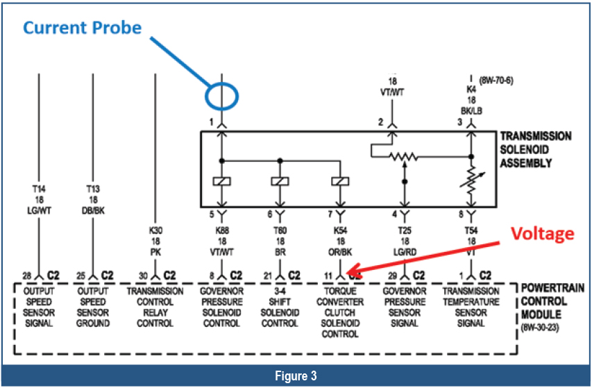At the same time, connect a current probe around the voltage feed wire to the transmission solenoid assembly. The easiest access to this wire is at the transmission connector. The object is to observe both voltage and current for the TCC solenoid while commanding it on and off with the scan tool.