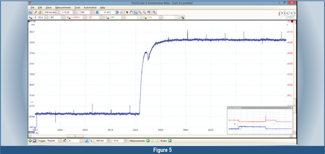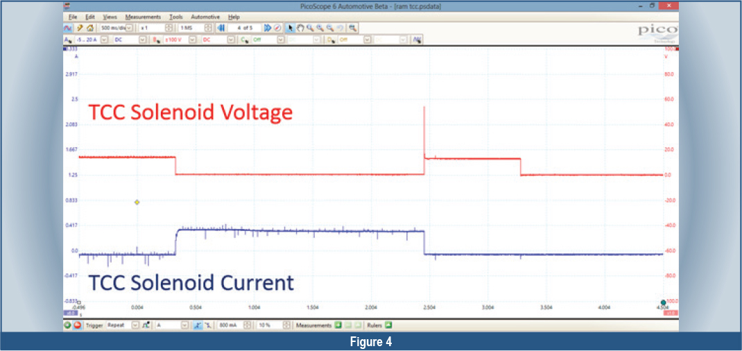 shown in blue, is the TCC solenoid current. Again you can observe the TCC driver turn on and off, just as in the voltage trace. But the current capture provides two more pieces of diagnostic information.
